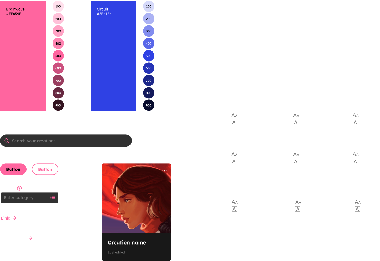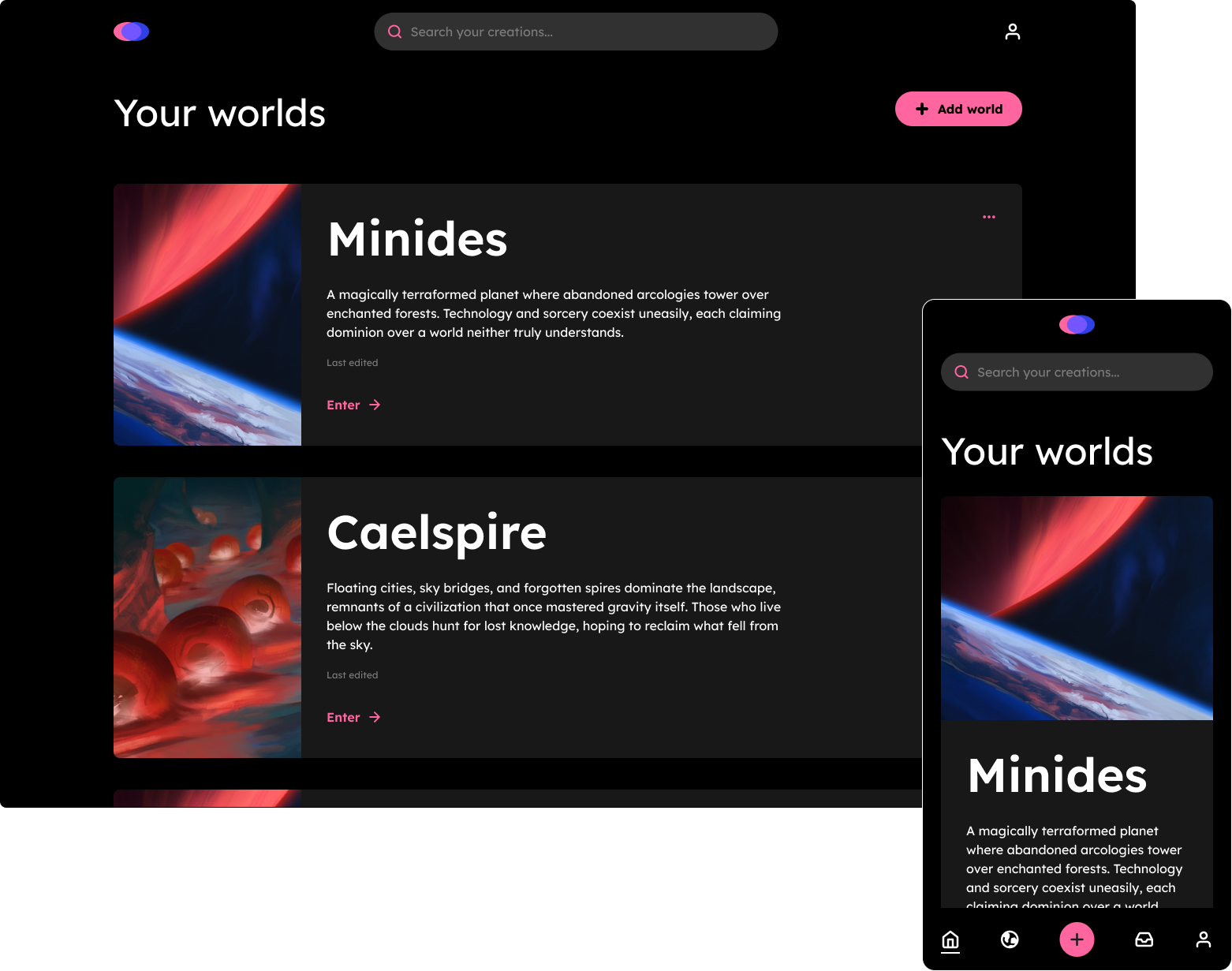 The color system reflects the balance between creativity and structure at the heart of the product. Pink represents the human, intuitive side of worldbuilding, while blue represents the system and recall layer. Dark mode was treated as a core feature, supporting use in low light environments and helping the interface stay unobtrusive during play.