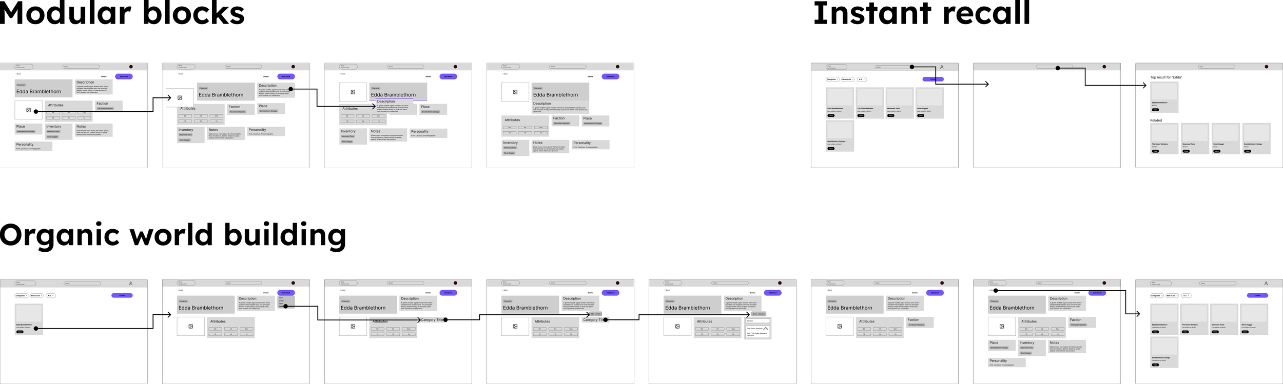 These insights led to three core design directions for Second Mind: instant recall through search as you type, organic world growth without manual linking, and customizable creation layouts that reflect each GM’s unique needs. With these requirements defined, I began translating them into early wireframes to explore how the interface could bring these ideas to life.